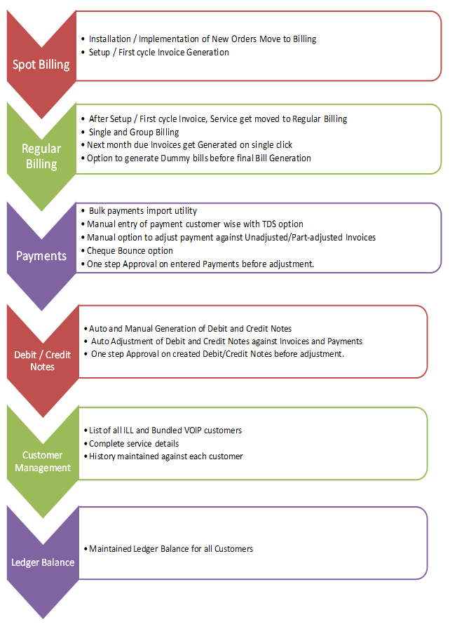 Bill Generation with Payment, Debit and Credit Notes option. Speed and accuracy in delivery of Bills to the Customer.